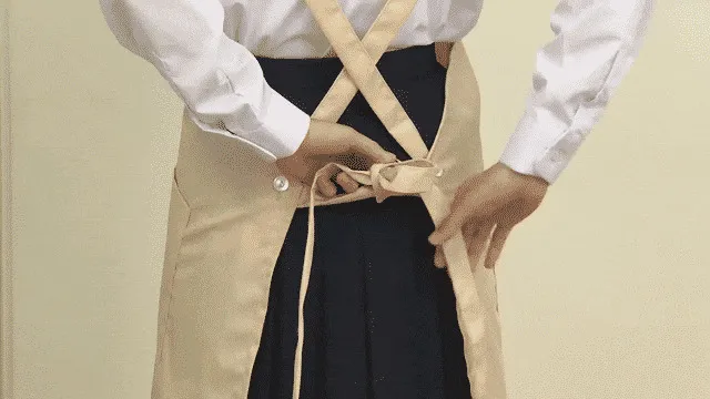 エプロンをつけ、ひもを結ぶ