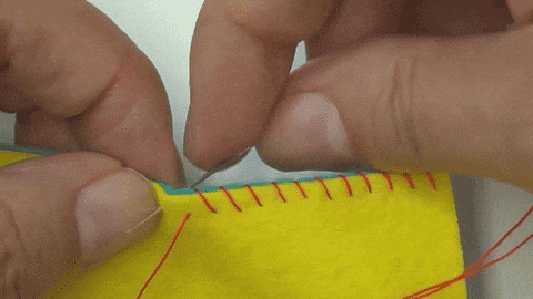 ぬい終わりにはりを置き、親指でおさえる