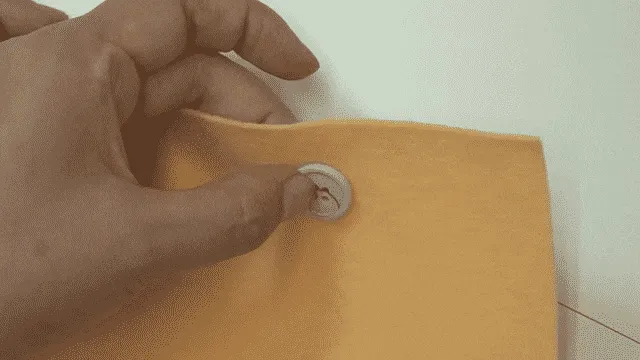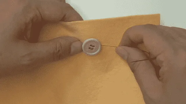 2つのあなにはりを通し、ぬのとボタンに間があくようぬう